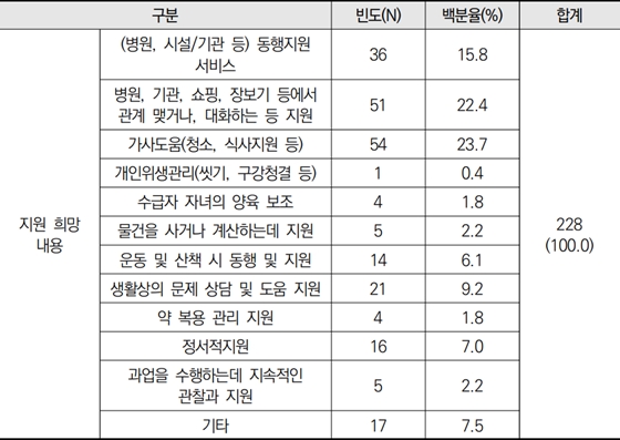 또한 활동지원서비스 시간 확대를 원하며 가사활동 및 사회활동지원 등을 희망했다. 그중 정서적 지원이 가장 높은 수요를 보이며 전통적인 지원방식보다는 지속적 관찰과 정서적 지원이 선호됐다.
