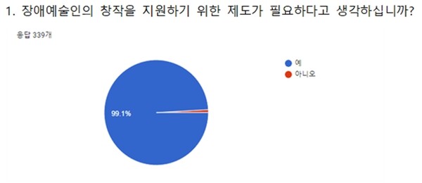 이 중 341명이 설문에 응했으며 장애예술인들은 ‘장애예술인 창작지원금제도’에 대해 99.1%가 필요하다고 응답했다.