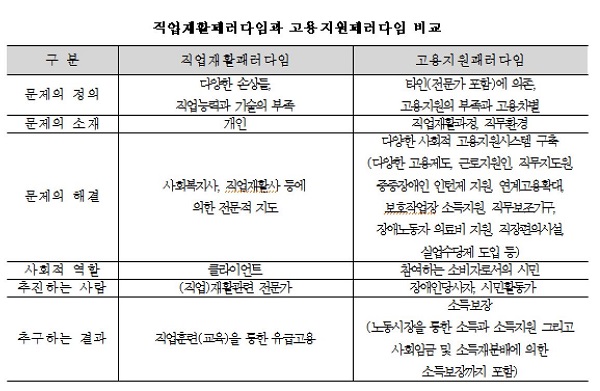 직업재활패러다임은 다소 심한 장애인 고용의 문제를 신체적・정신적으로 다양한 손상들과 심리사회적 직업경험 부족 그리고 직업능력과 기술의 부족으로 보고 있다. 반면, 고용지원패러다임에서는 장애인의 상황과 욕구에 적절한 사회적 고용지원시스템의 부족으로 인해 구직단계에서부터 고용차별을 받고 있으며, 장애인당사자가 지나치게 타인(나 이외의 다른 사람 – 전문가나 가족 등)에게 의존할 수밖에 없는 것을 문제로 보고 있다.