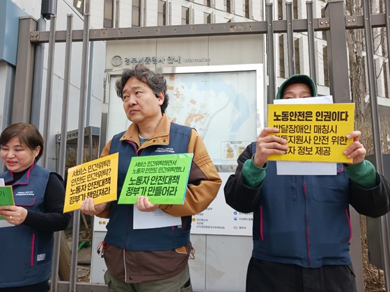 마지막으로 “우리는 정부가 책임지고 안전한 노동환경을 조성할 것과 불합리한 사업지침의 개선으로 노동자가 존중받으며 일할 수 있는 기반을 만들 것을 요구한다. 또한 노동자들이 겪는 어려움들에 대해서 제대로 알고 노동환경을 개선하도록 노동자와의 대화에 나서라”고 촉구했다.