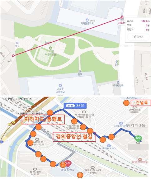 집에서 가재울중학교 등하굣길(사진 좌), 집에서 중암중학교 등하굣길. ©네이버지도