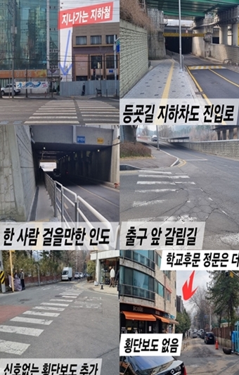 실제 집에서 중암중까지 걸으며 접하게 되는 신호등 없는 횡단보도, 횡단보도 표시 없는 건널목, 지하차도 통행로 등. ©에이블뉴스