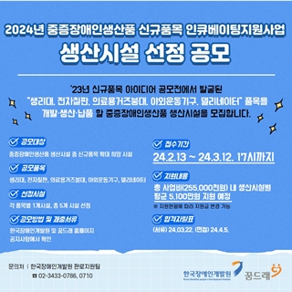 중증장애인생산품 인큐베이팅 지원사업은 공공기관에서 필요로 하지만 현재 중증장애인생산품으로 생산되지 않는 새로운 품목을 발굴하고, 그 품목을 생산할 생산시설을 선정해 지원하는 사업이다.