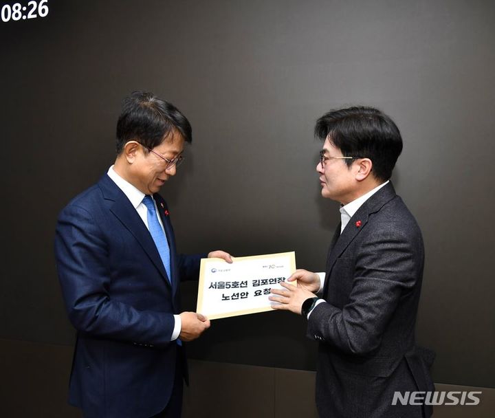 [김포=뉴시스] 김병수 김포시장이 지난해 12월 박상우 국토교통부 장관을 만나 김포골드라인 교통 혼잡 대책 일환으로 서울5호선 김포연장 노선요청서를 전달하고 있다.