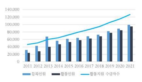 현재 장애인활동지원서비스는 전체 예산 중 1조 9,000억 원이라는 가장 큰 예산을 차지하며 활동지원사 수도 3배 이상 증가했다.