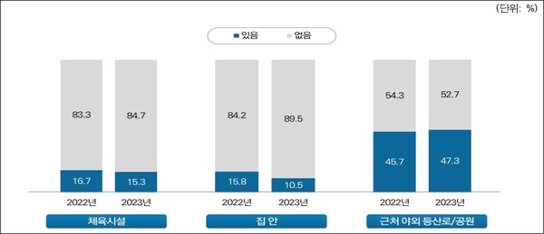 장애인이 주로 이용하는 운동 장소는 ‘근처 야외 등산로/공원’이 47.3%로 가장 많았다. 체육시설 이용률은 15.3%로 나타났으며 체육시설 이용률이 여전히 낮은 주요 이유는 ‘혼자 운동하기 어려워서’(29.9%), ‘시간이 부족해서’(19.0%), ‘체육시설과 거리가 멀어서’(12.9%) 순으로 조사됐다.