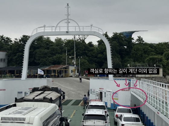 선실에 들어가기까지의 출입구엔 전부 계단이 설치돼 있어 이동이 불가능했으며, 휠체어 고정설비 및 교통약자 편의시설이 전무해 승선 내내 오로지 팔 근육에 의지해 느끼며 버틸 수밖에 없었다는 것.