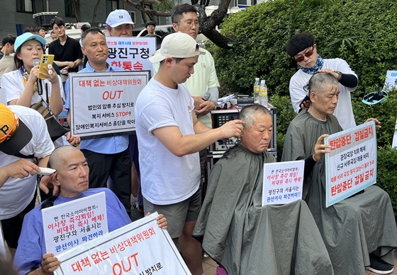 직위 해제돼 직무 대기 중인 최종길 정립회관 관장과 박용모 정립회관 팀장 등은 서울시와 광진구에 한국소아마비협회 각 산하시설이 정상적으로 운영될 수 있도록 해결하라고 촉구하며 삭발에 나섰다. ⓒ광진구 장애인 단체연합