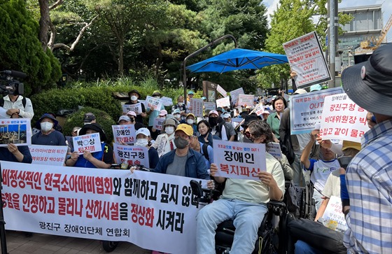 소아마비협회 산하시설과 이용자협의회, 광진구장애인단체연합(이하 광진구장애인연합)은 28일 오후 2시 서울 광진구청 앞에서 ‘한국소아마비협회 장애인 복지사업 압류 해결’ 촉구대회를 개최했다.