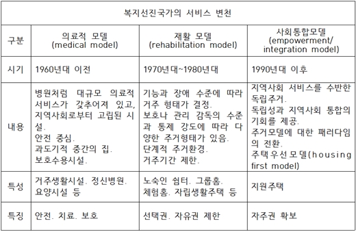 의료적 모델인 장애인거주시설은 반세기 전 사회적 환경에서 구축된 모형이다. 현재는 그 당시 환경 문화 의식주 등과 수준을 비교할 수 없을 정도로 사회·문화·환경이 발전되어 개인의 인권과 권리가 중요시되면서 평등과 형평성이 새롭게 조성되고 있다는 사실은 우리에게 이미 새롭지 않다. 과거의 ‘어떻게(how to live)’에서 ‘잘(well being)’이 주요점이 된 지금은 사생활권이 보장되는 독립적인 생활을 요구하고 있다.