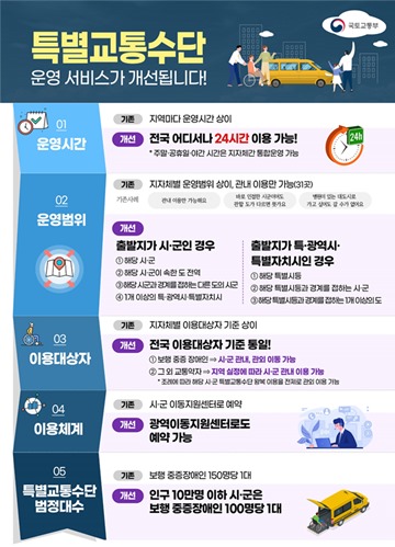 하지만 앞으로는 특별교통수단 운영비 일부에 대한 국비 지원과 함께 법령상 운영기준이 마련돼 전국 어디서나 특별교통수단의 24시간 이용 및 인근 특‧광역시, 도 등 광역 이동이 가능해진다.