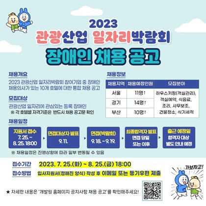 한국장애인개발원(원장 이경혜, 이하 개발원)은 오는 8월 25일까지 ‘2023 관광산업 일자리박람회’에 참여할 장애인 구직자를 모집한다.