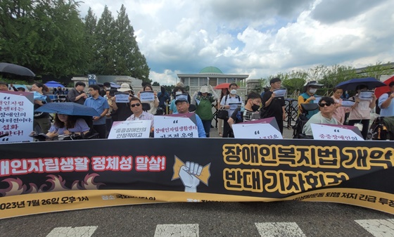 장애인복지법 개악 및 장애인자립생활운동 퇴행 저지 긴급투쟁단(이하 긴급투쟁단)은 26일 오후 1시 국회 정문 앞에서 기자회견을 개최, 이 같이 외쳤다.