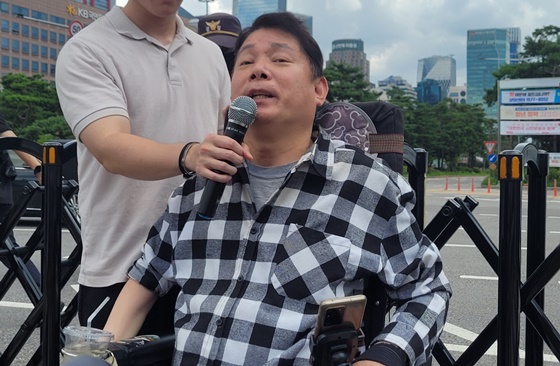 26일 오후 1시 국회 앞에서 개최된 ‘장애인복지법 개정안 저지’ 기자회견에서 발언하는 한국장애인자립생활센터협의회 최용기 회장. ©에이블뉴스