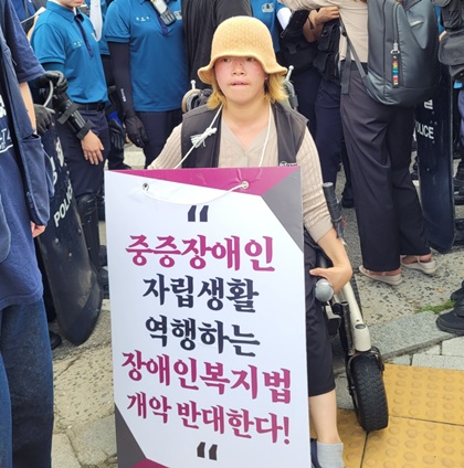 ‘중증장애인 자립생활 역행하는 장애인복지법 개악 반대한다’ 피켓을 목에 건 이음장애인자립생활센터 문애린 소장. ©에이블뉴스