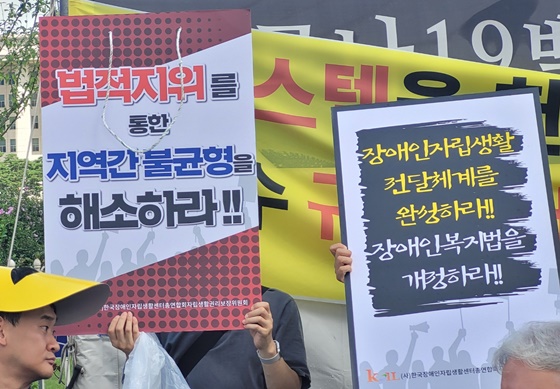 장애인복지법 개정을 촉구하는 피켓을 든 한국장애인자립생활센터총연합회 회원들. ©에이블뉴스