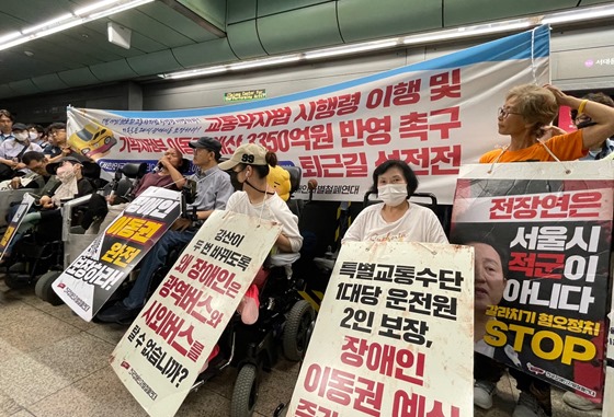이어 “말만 번지르르하게 보도자료를 내고, 법에 명시하면 무엇 하는가. 장애인의 현실은 그대로다. 해당 시행령 입법예고가 올해 1월이었는데 반년 동안 무엇을 한 것인가. 아무런 준비도, 대책도 없이 법만 만들고 시행한다고 하면 되는 것인가”라며 “특별교통수단 24시간 운행, 광역운행이 현실화될 수 있도록 계속해서 투쟁하겠다”고 외쳤다.