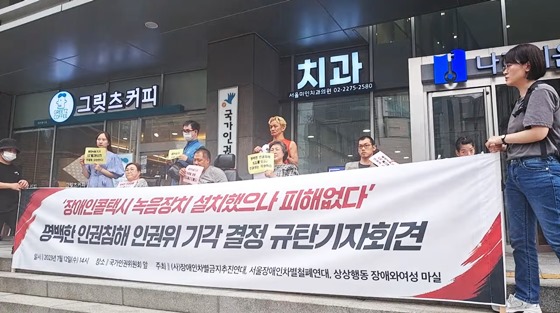 장애인차별금지추진연대(이하 장추련)은 12일 인권위 앞에서 서울장애인차별철폐연대, 상상행동 장애와여성 마실과 함께 ‘서울시 장애인콜택시 불법녹음설치 인권위 기각 결정 규탄 기자회견’을 개최했다.