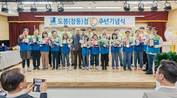 2013년 오픈 당시만 해도 신입의 풋풋함이 넘치던 장애인 직원들은 어느덧 10년 근속을 자랑하는 베테랑 직원이 되었습니다. 지난 3월에는 굿윌스토어 밀알도봉점의 설립 10주년을 기념하며 10년 동안 일해온 장애인 직원들에게 근속패와 꽃다발을 수여했는데요. 무려 24명의 직원들이 근속패를 받았습니다.