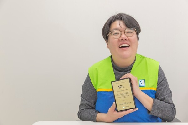 "열심히 일했더니 10년이 되었어요. 굿윌스토어의 좋은 점은 직원들과 함께 여행을 많이 가요. 직원들이랑 같이 밥도 먹고 카페도 가니까 서로 너무 친해요. 10년 동안 굿윌에서 행복하게 일하는 것이 제 꿈이었고, 또 다른 꿈이 있다면 유치원 교사가 되는 것입니다!” - 함초롱 사원-