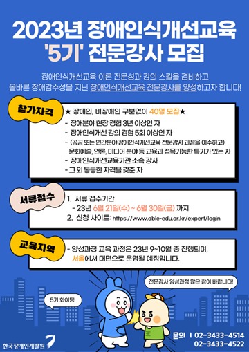 참가를 원하는 사람은 ‘장애인식개선교육 강사·기관 전용 시스템(https://www.able-edu.or.kr/expert/)’ 회원가입 후, 신청서 등 제출서류를 구비해 접수 마감일까지 제출하면 된다. 제출서류 양식은 개발원 누리집 공지사항(https://www.koddi.or.kr)에서 내려받으면 된다.