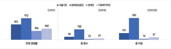 다만 장애인의 경우 전체 경험률은 39.6%에 불과했으며, 총횟수와 총비용 또한 서울시민 46회와 10.1만 원 대비 13회, 1.6만 원으로 그 차이가 매우 컸다.