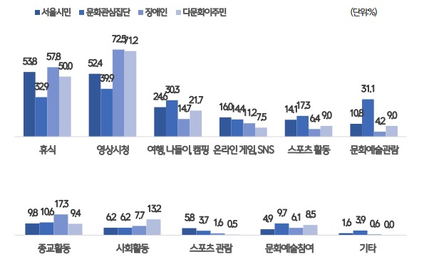 특히 장애인이 주로 하는 여가활동으로는 영상시청이 72.5%로 다른 집단 대비 매우 높게 나타났고, 여행/나들이/캠핑, 스포츠활동 등 외부활동은 꼴지 수준을 기록했다.
