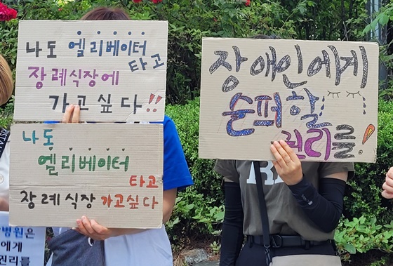 휠체어를 이용하는 지체장애인 남윤지 씨는 집 근처 국립병원에 장례식장으로 갈 수 있는 승강기가 설치돼 있지 않아, 다른 지역까지 가서 아버지의 장례를 치러야 했던 기억을 회상하며 분통을 터뜨렸다.