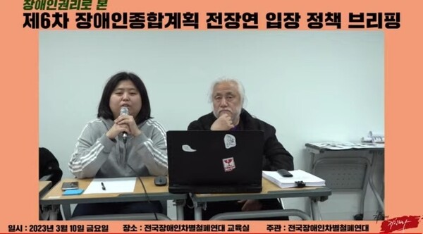 전국장애인차별철폐연대(전장연)는 10일 ‘장애인권리로 본 제6차 장애인정책종합계획 전장연 입장 정책브리핑’을 통해 제6차 장애인정책종합계획(이하 제6차 계획)에 대한 평가를 내렸다.