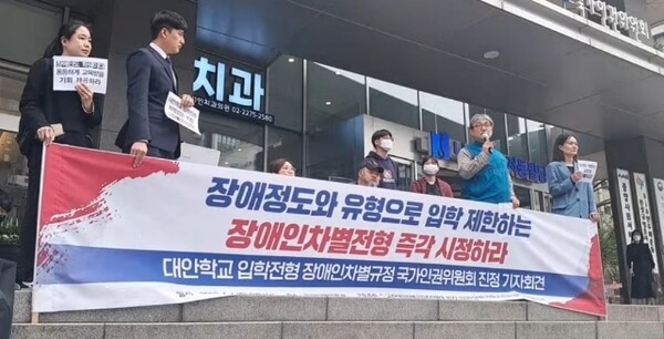 “장애정도와 유형으로 입학 제한하는 장애인차별전형 즉각 시정하라!”