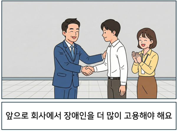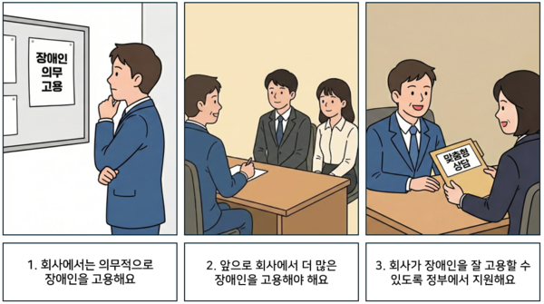 1 회사에서는 의무적으로 장애인을 고용해요. 2 앞으로 회사에서 더 많은 장애인을 고용해야 해요. 3 회사가 장애인을 잘 고용할 수 있도록 정부에서 지원해요. ©AI 편집실