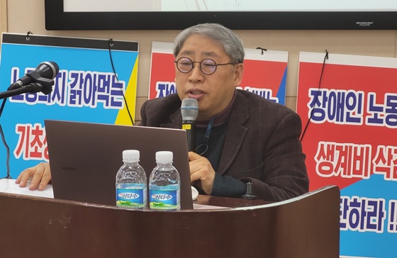 21일 오후 3시 서울 여의도 이룸센터에서 열린 '기초생활수급장애인의 고용 확대를 위한 제도 개선 방안' 토론회에서 발제하는 나사렛대학교 인간재활학과 우주형 교수. ©에이블뉴스