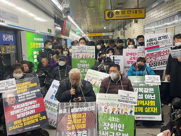 2023년 2월 20일 서울 혜화역 승강장에서 서울경찰청 최종통첩에 대한 최종입장발표 기자회견을 연 모습.ⓒ전국장애인차별철폐연대