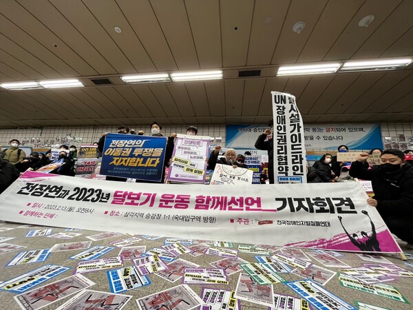 전국장애인차별철폐연대가 13일 서울 4호선 삼각지역(1-1) 승강장에서 ‘시민과 함께 하는 달보기 운동’ 함께 선언 기자회견을 가졌다.ⓒ전국장애인차별철폐연대