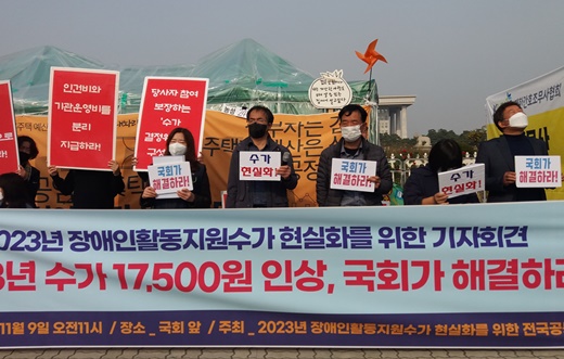 2023년 장애인 활동지원 수가 현실화를 위한 전국공동행동(이하 공동행동)이 9일 오전 11시 국회 앞에서 기자회견을 갖고, 내년도 장애인활동지원 수가를 1만7500원으로 현실화할 것을 거듭 촉구했다.ⓒ2023년 장애인 활동지원 수가 현실화를 위한 전국공동행동 에이블포토로 보기▲ 2023년 장애인 활동지원 수가 현실화를 위한 전국공동행동(이하 공동행동)이 9일 오전 11시 국회 앞에서 기자회견을 갖고, 내년도 장애인활동지원 수가를 1만7500원으로 현실화할 것을 거듭 촉구했다.ⓒ2023년 장애인 활동지원 수가 현실화를 위한 전국공동행동