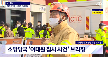 이태원 압사 참사 수습 과정을 설명하는 소방당국 담당자. ⓒJTBC 뉴스 화면 갈무리 에이블포토로 보기▲ 이태원 압사 참사 수습 과정을 설명하는 소방당국 담당자. ⓒJTBC 뉴스 화면 갈무리