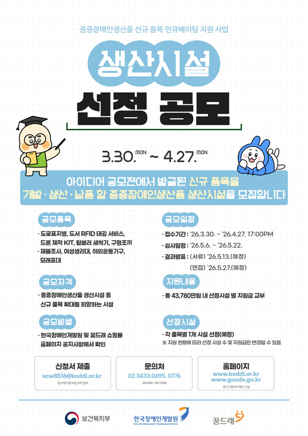 【에이블뉴스 이슬기 기자】한국장애인개발원이 중증장애인생산품의 품목 다양화를 통한 공공기관 우선구매 시장 확대를 위해 오는 4월 27일까지 ‘2026년 중증장애인생산품 신규 품목 인큐베이팅 지원사업 생산시설 공모’를 실시한다.