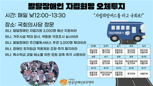 구체적으로 ▲발달장애인 사각지대 예산 추경 편성(주간활동 대기자 3000명 해소 등) ▲장애인지역사회자립법 기반 자립지원 확대 ▲인천 색동원 학대 참사 국정조사 및 시설 폐쇄 대책 마련 ▲장애인 최저임금 적용 제외 폐지 ▲특수학급 법정 정원 감축 및 교육권 보장 등 5가지 요구안을 제시했다. 부모연대 오체투지는 국회의사당 정문 앞에서 주말을 제외한 매일 정오에 진행된다.
