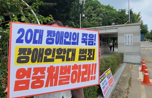서울고등법원 앞에서 ‘20대 장애인의 죽음! 장애인학대 범죄 엄중처벌하라!!’ 피켓을 들고 있는 모습.ⓒ에이블뉴스 에이블포토로 보기▲ 서울고등법원 앞에서 ‘20대 장애인의 죽음! 장애인학대 범죄 엄중처벌하라!!’ 피켓을 들고 있는 모습.ⓒ에이블뉴스