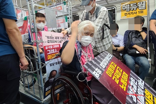 전국장애인차별철폐연대가 지난 8월 1일 ‘출근길 지하철 탑니다’ 투쟁을 한 달 여만에 재개한 모습. 지하철 투쟁을 펼치는 전장연 박경석 공동대표와 이동식 철제칸에 들어간 권달주 상임공동대표.ⓒ에이블뉴스DB 에이블포토로 보기▲ 전국장애인차별철폐연대가 지난 8월 1일 ‘출근길 지하철 탑니다’ 투쟁을 한 달 여만에 재개한 모습. 지하철 투쟁을 펼치는 전장연 박경석 공동대표와 이동식 철제칸에 들어간 권달주 상임공동대표.ⓒ에이블뉴스DB