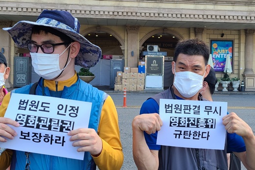 1일 CGV 왕십리점 앞에서 열린 2차 기자회견 역시 시범상영으로 시간끌기를 하는 영진위와 함께 법원의 판결을 받아들이지 않는 극장 사업자들에 대한 비판이 줄을 이었다.