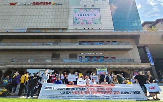 장애인차별금지추진연대(장추련) 등 7개 단체가 1일 CGV 왕십리점 앞에서 영화진흥위원회 규탄 릴레이 2차 기자회견을 진행했다.ⓒ에이블뉴스 에이블포토로 보기▲ 장애인차별금지추진연대(장추련) 등 7개 단체가 1일 CGV 왕십리점 앞에서 영화진흥위원회 규탄 릴레이 2차 기자회견을 진행했다.ⓒ에이블뉴스