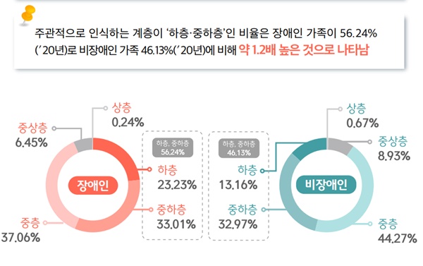 한국장애인개발원(이하 개발원)이 1일 발표한 koddi 통계 뉴스레터 2022년 3호 ‘통계로 보는 장애인 가족’에 따르면, 장애인 가족의 ‘주관적 계층의식’ 조사 결과 ‘하층, 중하층’으로 인식하는 비율이 56.24%로 비장애인 가족 46.13%에 비해 약 1.2배 높다.