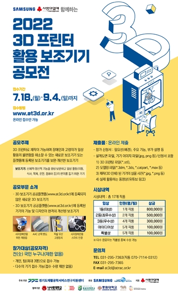 자세한 사항 및 신청은 ‘3D 프린터 활용 보조기기 공모전 온라인 접수 시스템(www.at3d.or.kr)을 통해 확인할 수 있다.
