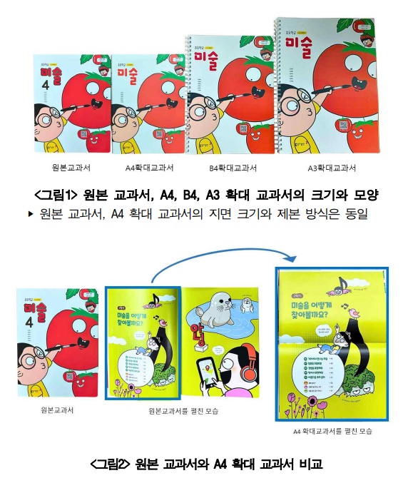 국립특수교육원은 이런 의견을 반영해 A4 확대 교과서를 제작·보급하게 됐다. A4 확대 교과서는 일반교과서와 지면의 크기는 같지만, 글자와 그림을 2배로 확대하고, 무선 제본으로 내구성을 개선한 것이다.