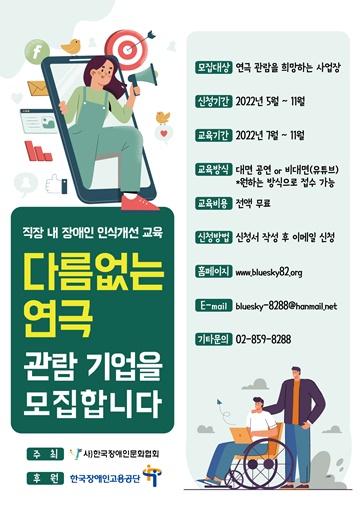 한국장애인문화협회가 문화체험형 직장 내 장애인 인식 개선 교육 ‘다름없는 연극’의 교육 대상 사업체 및 기관을 11월까지 상시 모집한다.ⓒ한국장애인문화협회 에이블포토로 보기▲ 한국장애인문화협회가 문화체험형 직장 내 장애인 인식 개선 교육 ‘다름없는 연극’의 교육 대상 사업체 및 기관을 11월까지 상시 모집한다.ⓒ한국장애인문화협회