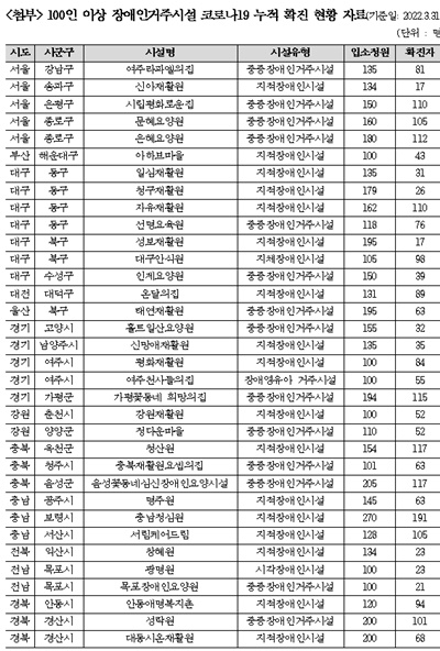 100인 이상 장애인거주시설 코로나19 누적 확진 현황 자료(2022년 3월 31일 기준).ⓒ장혜영의원실 에이블포토로 보기▲ 100인 이상 장애인거주시설 코로나19 누적 확진 현황 자료(2022년 3월 31일 기준).ⓒ장혜영의원실