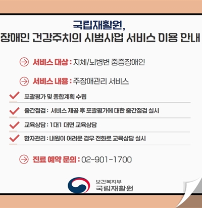 국립재활원은 지체·뇌병변 중증장애인에게 장애인 건강주치의 시범사업 서비스 유형 중 주(主)장애관리 서비스를 제공한다.