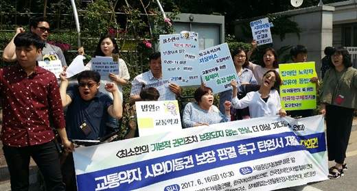 교통약자 이동권소송연대가 2017년 6월 16일 서울중앙지방법원 앞에서 2심 판결을 앞두고 “시외이동권을 보장하라”고 기자회견을 열었다.ⓒ에이블뉴스DB 에이블포토로 보기▲ 교통약자 이동권소송연대가 2017년 6월 16일 서울중앙지방법원 앞에서 2심 판결을 앞두고 “시외이동권을 보장하라”고 기자회견을 열었다.ⓒ에이블뉴스DB