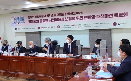 장애우권익문제연구소는 27일 서울 국회의원회관에서 ‘장애인의 동등한 시외이동권 보장을 위한 토론회’를 개최했다. 이날 토론회는 8년 만에 대법원 판결이 선고된 장애인 시외이동권 소송 결과의 문제점을 짚으며, 국토교통부 등 정부의 이동권 개선방안에 대해 의견을 수렴했다.
